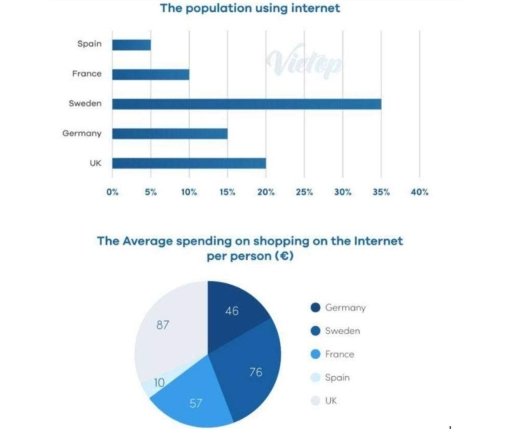 The bar chart illustrates the proportion of Internet users in five European countries in 2000, while the pie chart shows the average time citizens in those countries spent on online shopping during the same year.