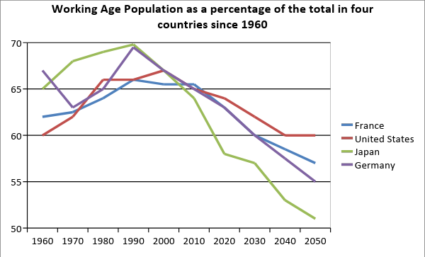 The line graph compares the proportion of working-age adults in France, the United States, Japan, and Germany from 1960 to 2015, with projections extending to 2050.