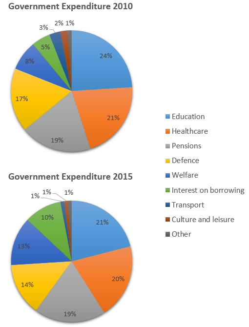 The charts illustrate the proportion of government expenditure allocated to nine categories in 2010 and 2015. Over this period, notable shifts occurred, with reductions in most major sectors and increases in borrowing costs and welfare.