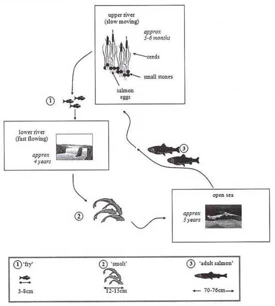The diagram below show the life cycle of a species of large fish called the salmon.
