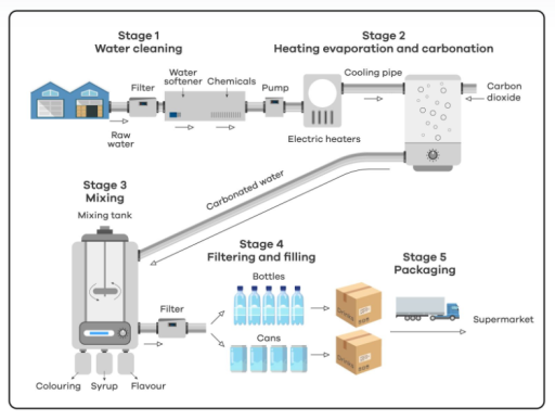 Overall, the process comprises five main stages: water purification, heating and carbonation, mixing, filtration and filling, and packaging. Each step is essential in transforming untreated water into a finished beverage ready for sale.