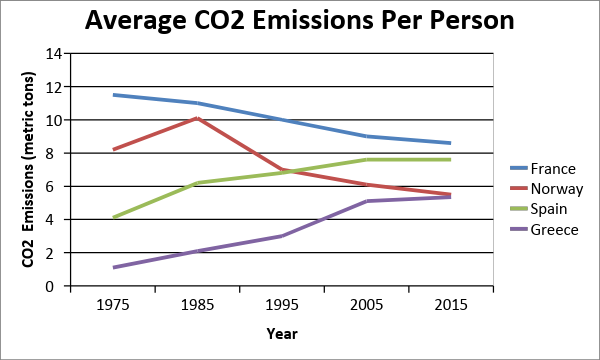 The graph below shows average carbon dioxide (Co2) emissions per person in the United Kingdom, Sweden, Italy, and Portugal between 1967 and 2007.