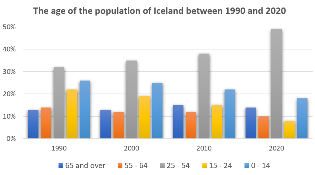 The bar chart illustrates the distribution of the population in Iceland across five age groups from 1990 to 2020.