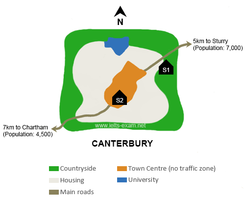 The map below is of the town of Canterbury. A new school (S) is planned for the area. The map shows two possible sites for the school.