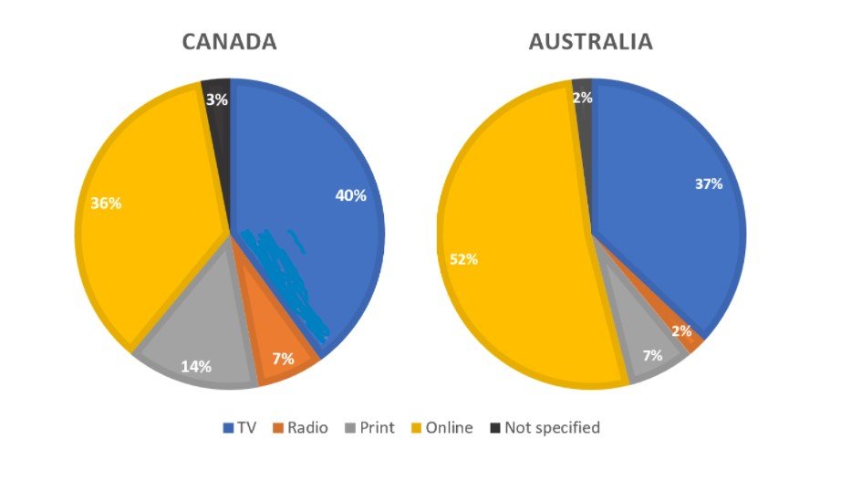 These figures suggest a stronger preference for digital news consumption in Australia, while Canada maintained a more balanced split between traditional and online media.