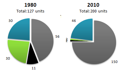 Germany’s energy profile in 1980 was more balanced. Coal and natural gas each produced 28 units, with petroleum and nuclear accounting for most of the remainder, and hydro contributing only 7 units. By 2010, however, the country had undergone a dramatic shift: nuclear power, absent from New Zealand’s mix, surged to become the dominant source, producing 155 units, or nearly three-quarters of total output. Coal and petroleum together supplied just 55 units, and other sources were minimal.