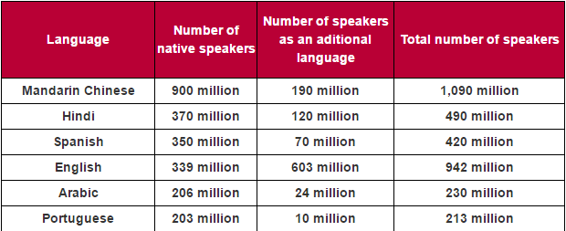 The table compares the six most widely spoken languages in terms of native speakers and the number of people using them as an additional language.