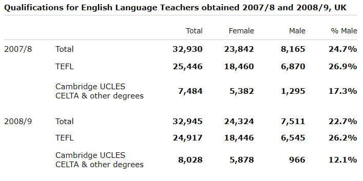 The table below shows the number of students living in the UK gaining English language teacher training qualifications in 2007/8 and 2008/9, and the proportion of male qualifiers.