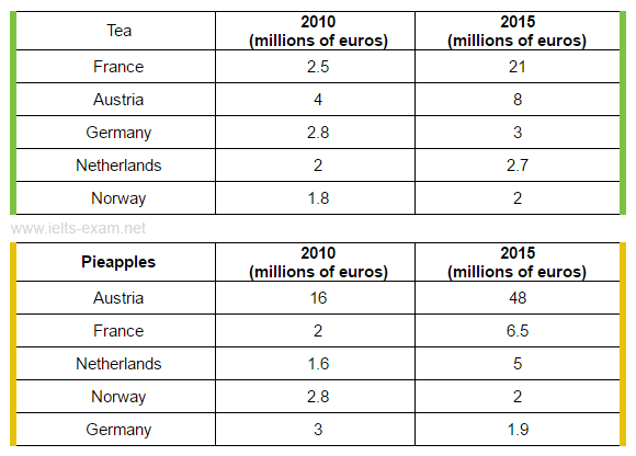 The tables below give information about sales of Fairtrade*-labelled tea and pineapples in 2010 and 2015 in five European countries.